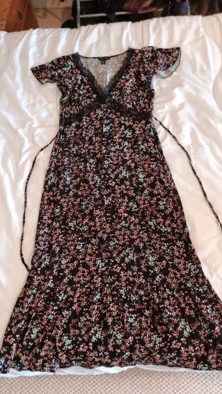 The New Look Floral Midi Dress with Lace Detail is available in sizes M.
