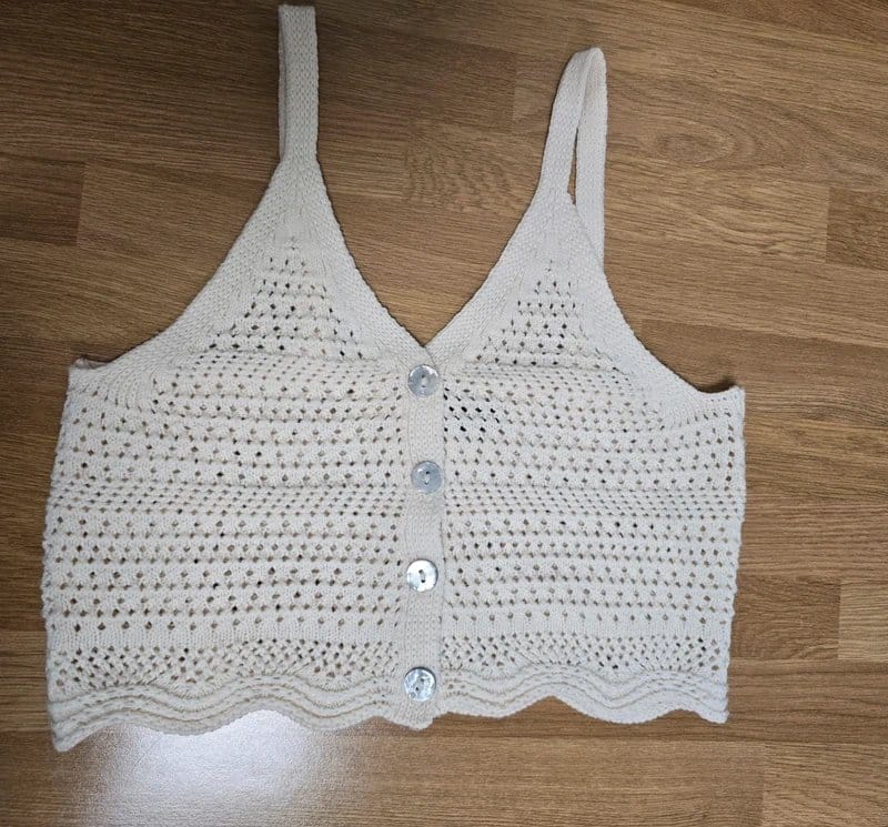 The New Look Off White Crochet Knit Frill Hem Crop Vest Size 10 is available in sizes S.
