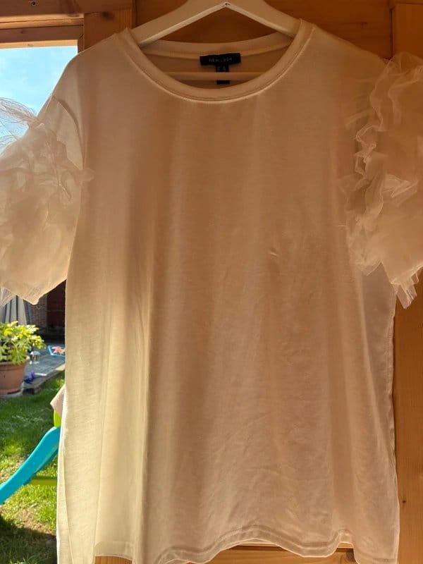 Off White T-shirt with tulle shoulder detail from New Look. The tee features a classic crew neckline and short sleeves, crafted from a lightweight fabric for a comfortable fit. The tulle shoulder detail adds a touch of elegance and whimsy to the simple design. Perfect for casual outings or as a layering piece.