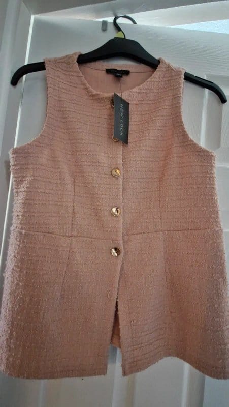 View Vinted's returns policyStylish apricot waistcoat-style top by New Look. Features a button-up front with gold buttons and a textured fabric for a chic look. Perfect for layering over casual outfits.