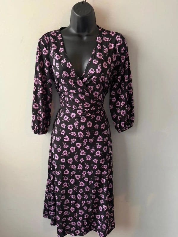 Elegant black midi dress featuring a pink floral pattern. The dress has a flattering V-neckline with a wrap-style bodice and fitted waist. 3/4 length sleeves with slight puff and elasticated cuffs add a stylish touch. Perfect for casual or semi-formal occasions.