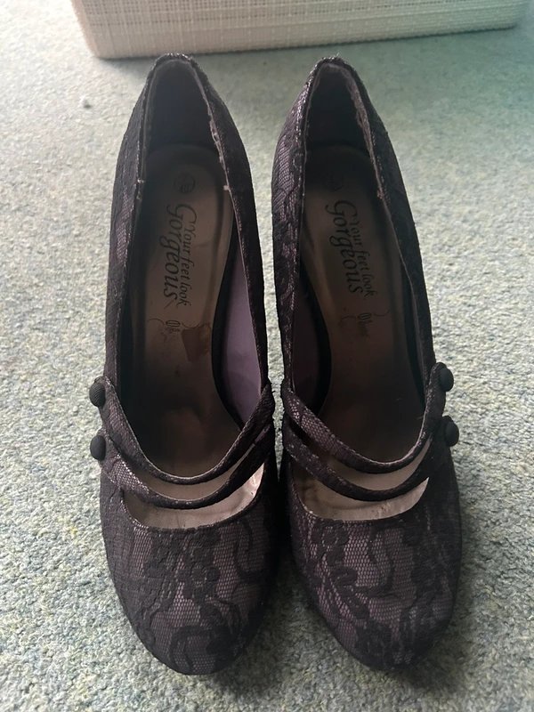 Purple and black lace heels from New Look. Designed with a lace overlay and buckle detailing. Perfect for adding a touch of elegance to any outfit.