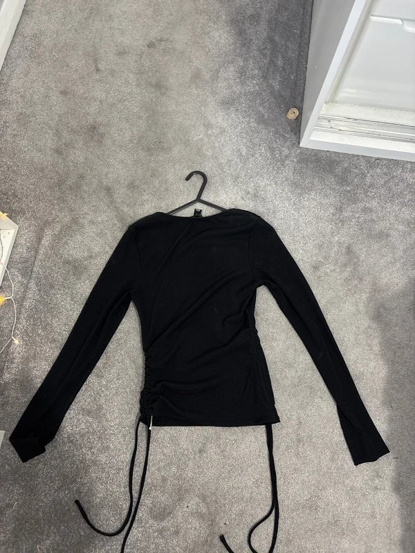 The New Look Ruched Black Long Sleeve Top is available in sizes S.