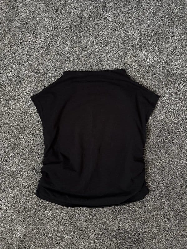 Stylish black crop top with a ruched side detail for a flattering fit. Made from stretchy fabric for comfort and a slight mark at the back of the neck that may come out in wash.
