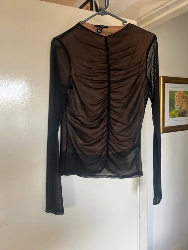 Black and brown ruched top from New Look. Features a sheer, mesh fabric with a ruched design for a dramatic look. Perfect for adding a touch of drama to any outfit.
