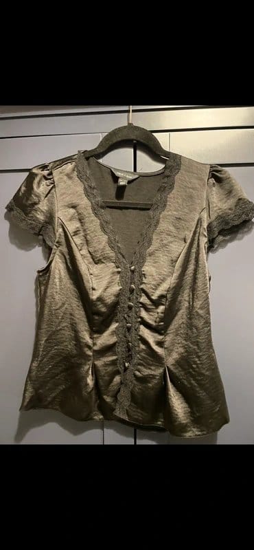 Stylish bronze satin top with a V-neckline and lace detailing. Features short sleeves and a button-down front. Perfect for evening wear or special occasions.