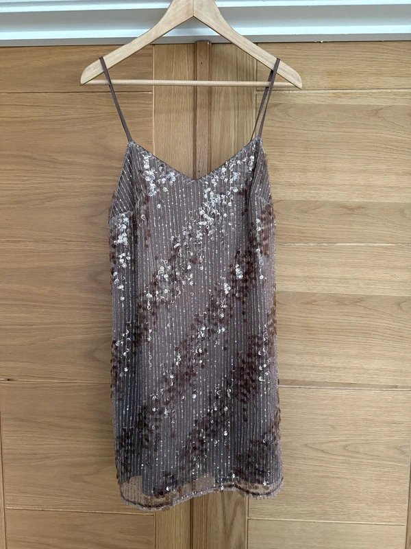 The New Look Strappy Sequin Mini Dress in Brown is available in sizes M.