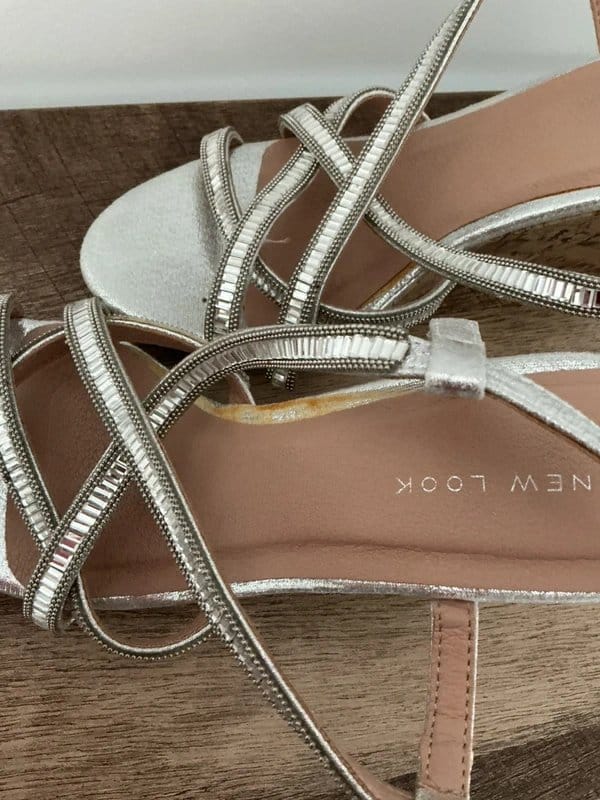 Beautiful silver wedge sandals from New Look, perfect for weddings, holidays, or summer parties. These feature stunning diamanté/beaded embellishments on the straps and a classic cork-effect wedge heel.