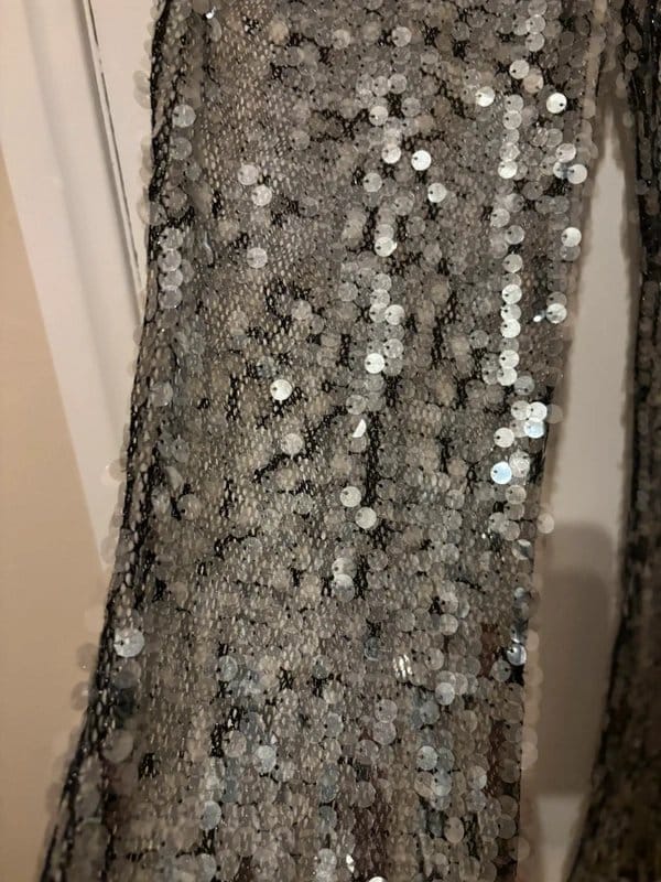 Gorgeous super fun sparkly trousers in silver sequin. Features a sheer flared design for a dramatic look. Perfect for evening events or parties.
