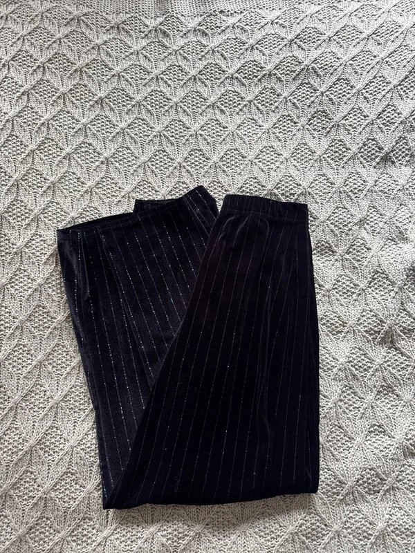 Crafted with sparkly black velvet, these wide leg leggings feature a striped design that adds a touch of sparkle. Perfect for a casual chic look, these leggings are versatile and flattering.