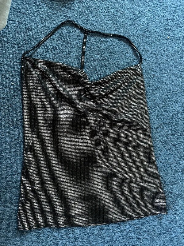 The New Look Black and Silver Sparkly Halter Top is ideal for party, evening, date-night.