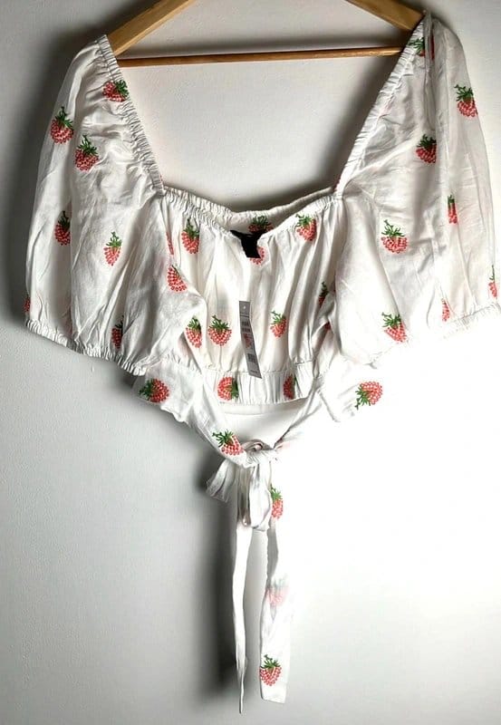 Elegant and playful, this white/red embroidered crop top from New Look features charming strawberry motifs. Perfect for a casual summer look, this top pairs beautifully with high-waisted shorts or skirts.