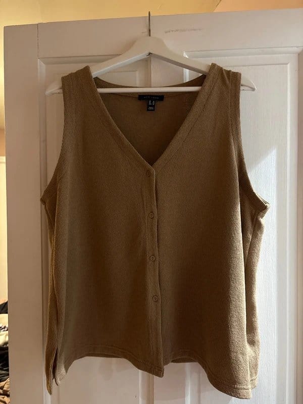 Stylish taupe ribbed sleeveless top by New Look. Featuring a V-neckline and button-down front, this top is perfect for a casual yet chic look. Made from a stretchy ribbed fabric, it offers a relaxed fit ideal for everyday wear.