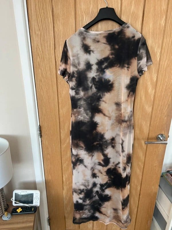 The New Look Beige & Brown Tie-Dye Mesh Dress is available in sizes M.