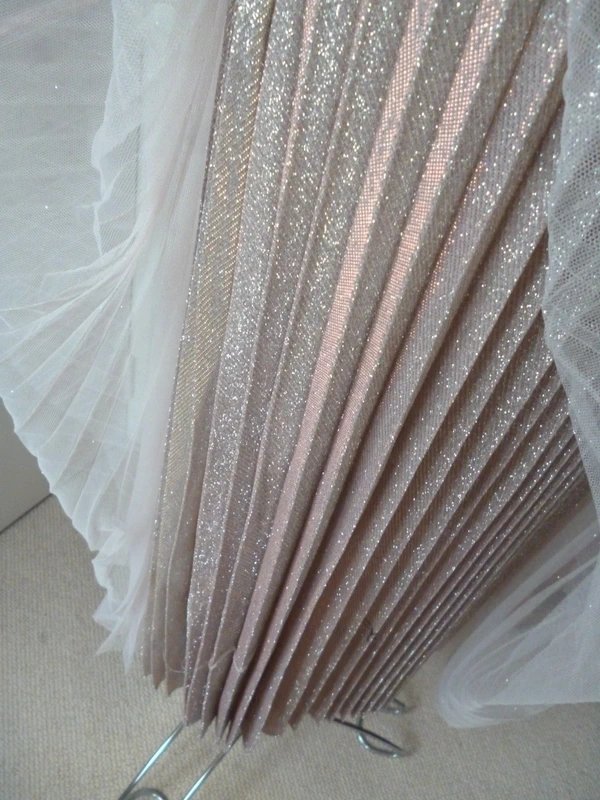 Designed in pale pink, this midi skirt features pleated tulle, net, and mesh over a glitter pleated underskirt. Ideal for daytime glam or evening sparkle.