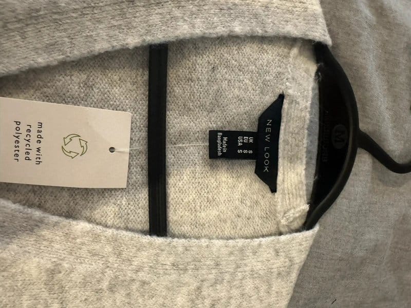 The New Look Silver V-neck Jumper, Size S is made from polyester, cotton.