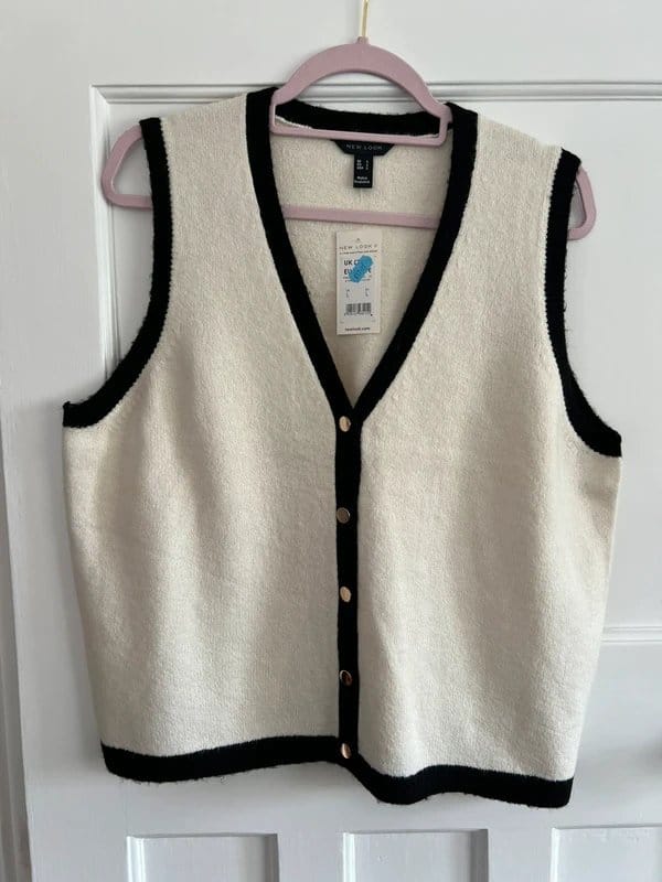 This cream-colored, knitted waistcoat from New Look features a V-neckline and button closure, providing a cozy yet stylish addition to your wardrobe. Ideal for layering over tops or dresses, it adds a touch of warmth and texture to your outfits.