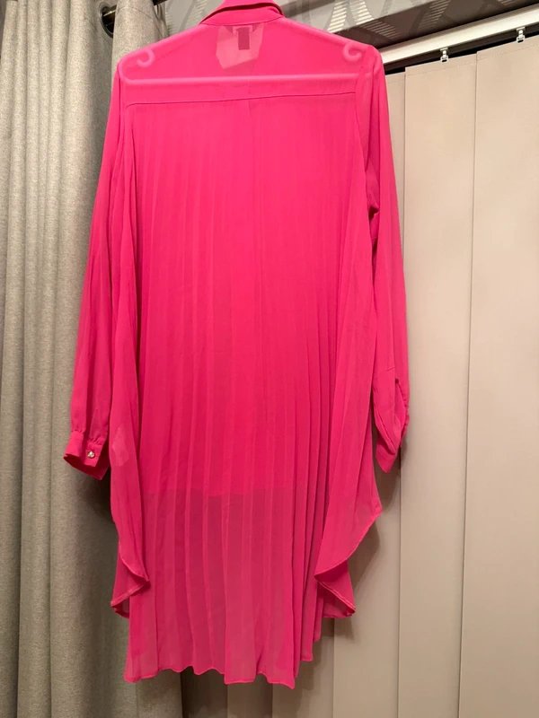 Hot pink sheer tulle blouse shirt with tailed pleated back. Perfect for a bold statement look. Crafted from lightweight sheer tulle, this long-sleeve blouse features a tailed pleated back for a dramatic effect. Ideal for adding a touch of glamour to any outfit.