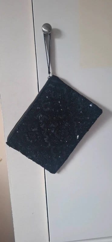 View Vinted's returns policyElegant black beaded clutch bag from New Look. Features geometric beading and a zip closure. In very good condition, perfect for evening events or special occasions.