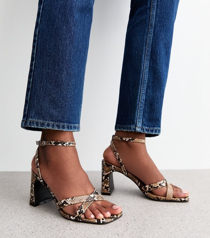 Elegant brown snake-print sandals from New Look. Crafted from faux leather with slim crossover straps and a block heel for a glamorous lift. Perfect for adding a statement touch to any outfit.