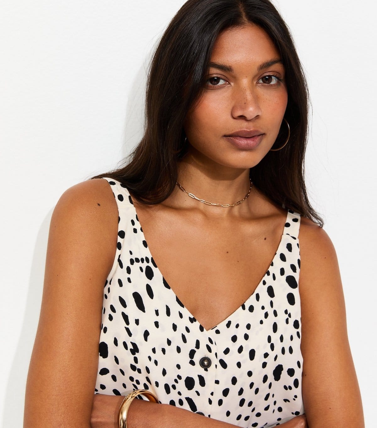 View New Look UK's returns policyStriking abstract print on this cream cami top from New Look. It features a V-neckline and a central button closure, making it versatile for layering or wearing solo. Perfect for casual and relaxed occasions.