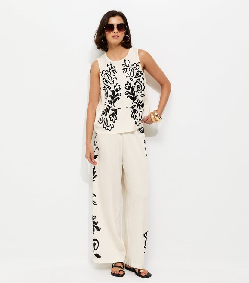 These wide leg trousers feature a bold floral print running down the sides. Made from a relaxed fit woven fabric, they pair perfectly with the matching cream top for a summer co-ord.