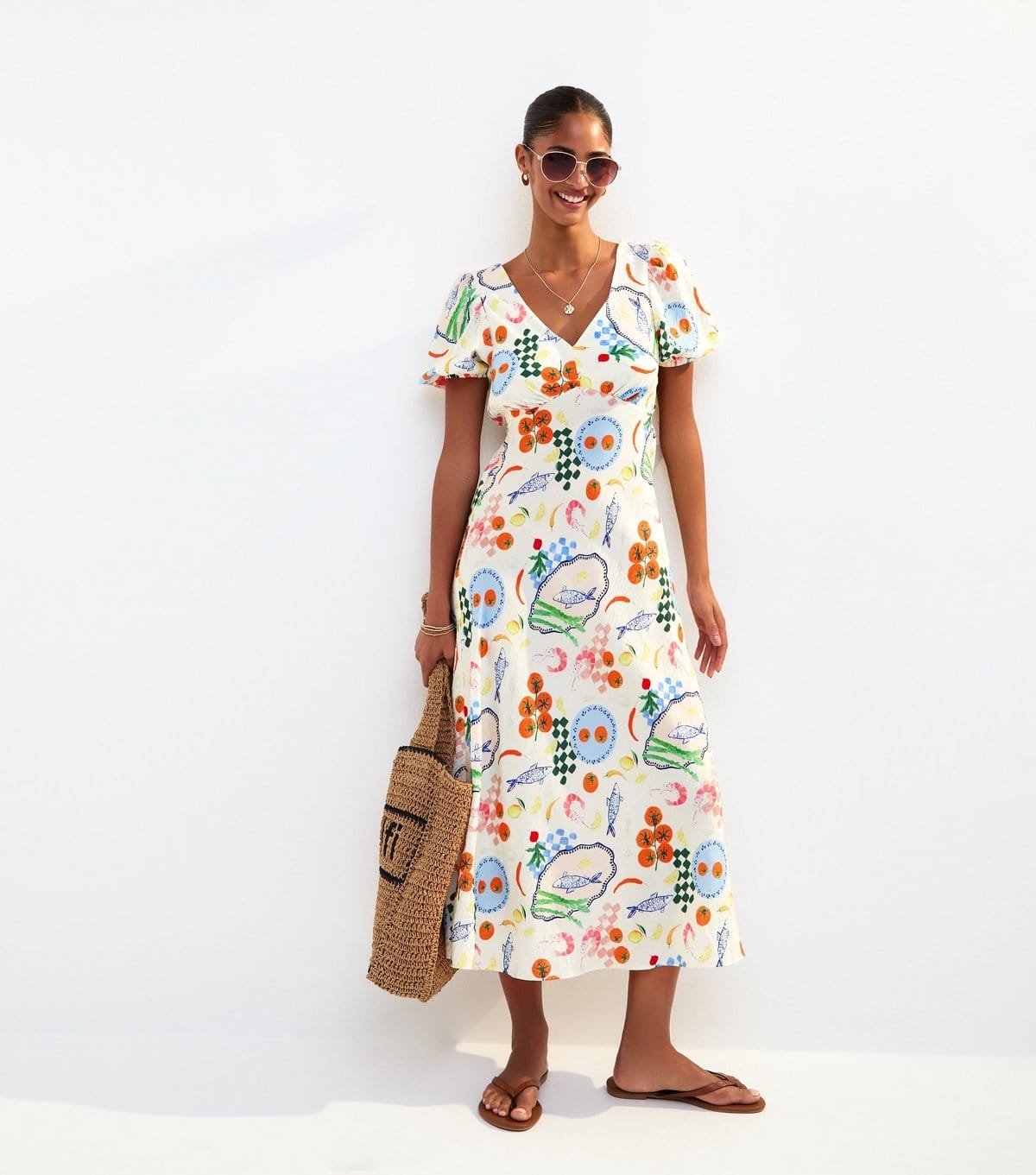The New Look Cream Fish Print Textured Puff Sleeve Midi Dress is ideal for casual, beach, daytime.