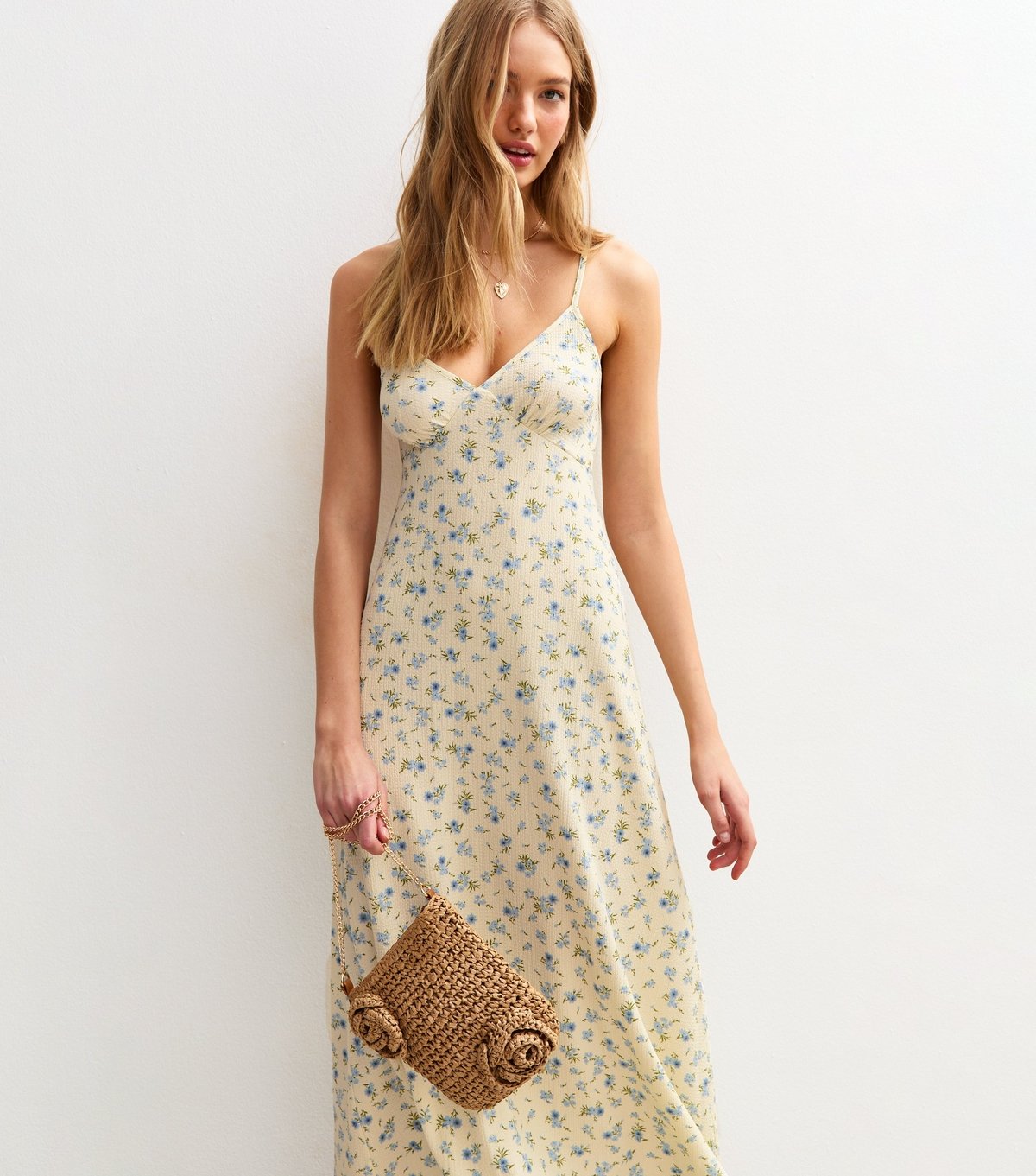 The New Look Cream Floral Print Midi Dress is made from crinkle.