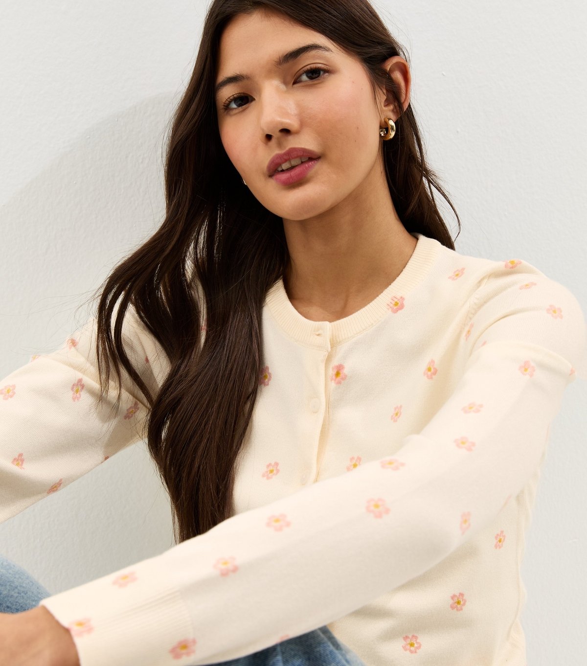 Lightweight knit cardigan in cream with a crew neck and light pink floral print. Ideal for layering over casual outfits.