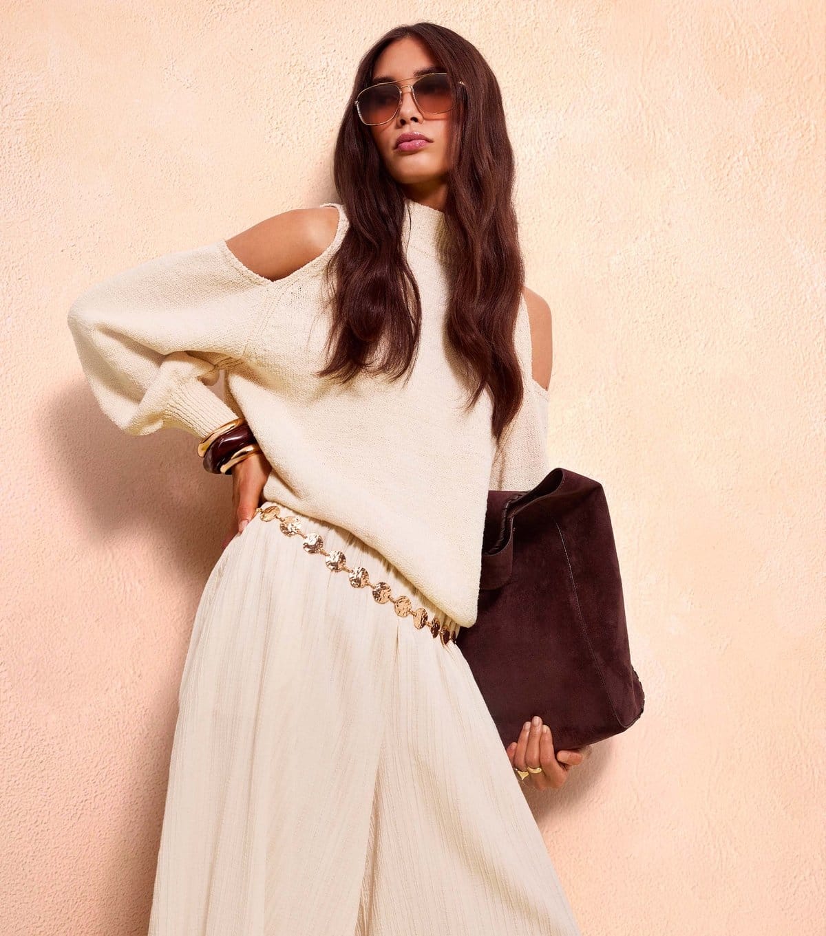 “Pair with cream wide-leg trousers and gold statement belt for a chic, monochromatic look.”