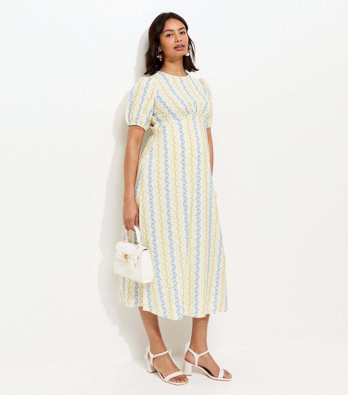 Stylish maternity midi dress in cream with yellow and blue floral stripes. The woven fabric flows gracefully over your bump, and the back waist can be cinched to your preference. Perfect for casual and semi-formal occasions.