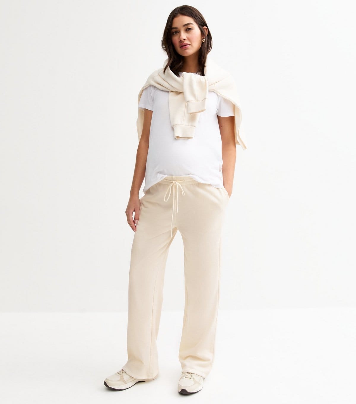 See all outfit ideasComfortable maternity wide leg joggers in cream by New Look. Designed with a stretchy over-the-bump panel and an elasticated drawstring waistband. Perfect for everyday wear during pregnancy.
