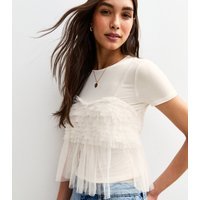 This off white cami top from New Look features a jersey base with a tulle overlay. The tulle adds a delicate, flowing texture with ruffles for a feminine touch. Ideal for casual wear.