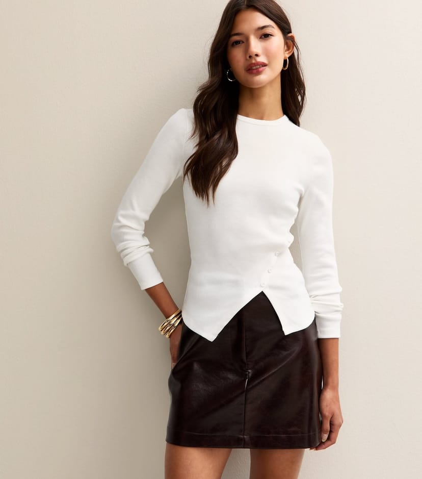The New Look Off White Asymmetric Button Long Sleeve Top is made from rib jersey.