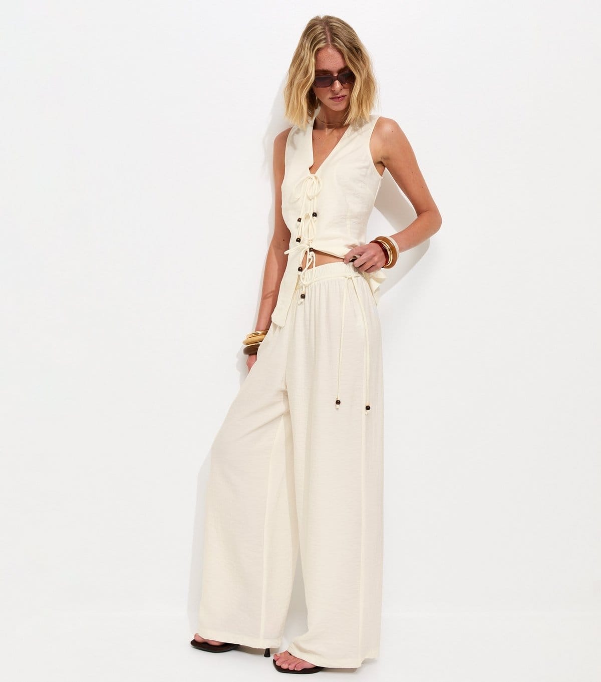 The New Look Off White Beaded Tie Wide Leg Trousers is ideal for casual, beach, daytime.