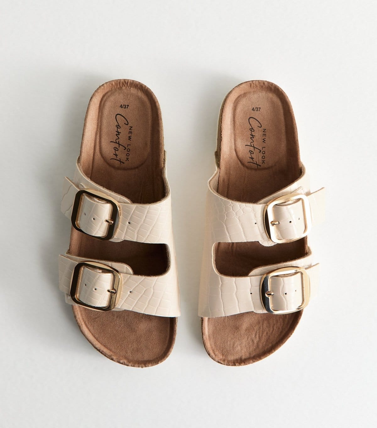 The New Look Off White Faux Leather Flat Sandals is available in sizes 9.