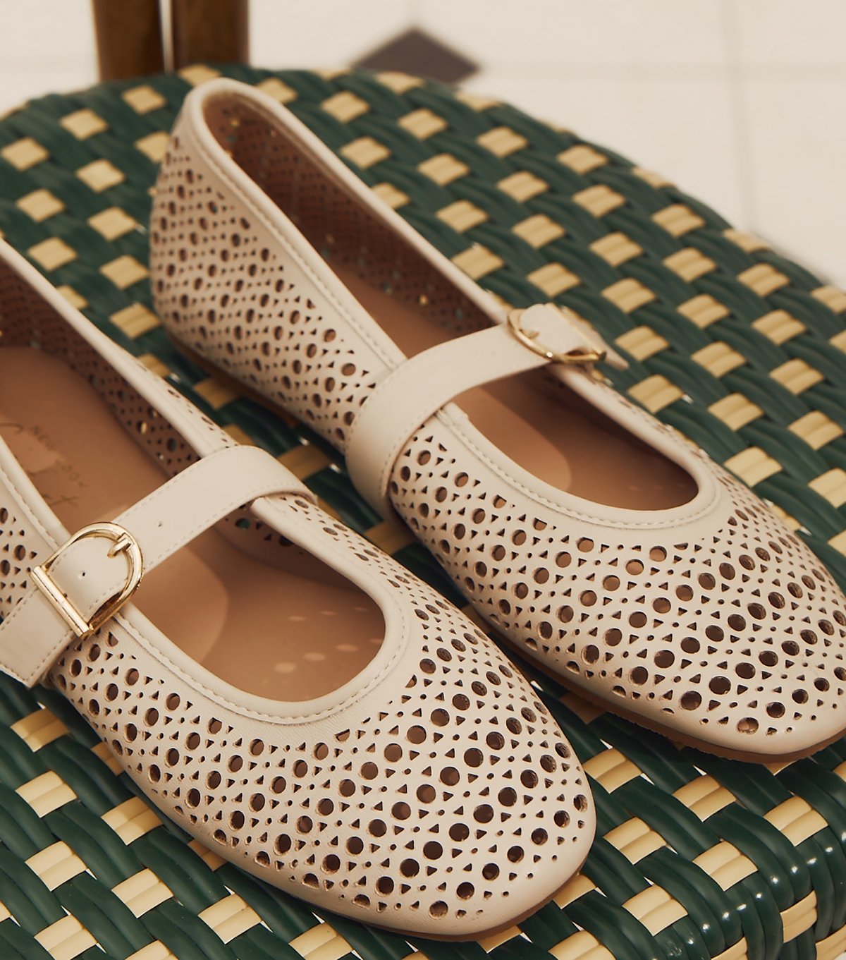 Stylish off-white faux leather Mary Jane shoes with a lazer-cut design and side buckles. Perfect for daytime wear with their comfortable and elegant look.