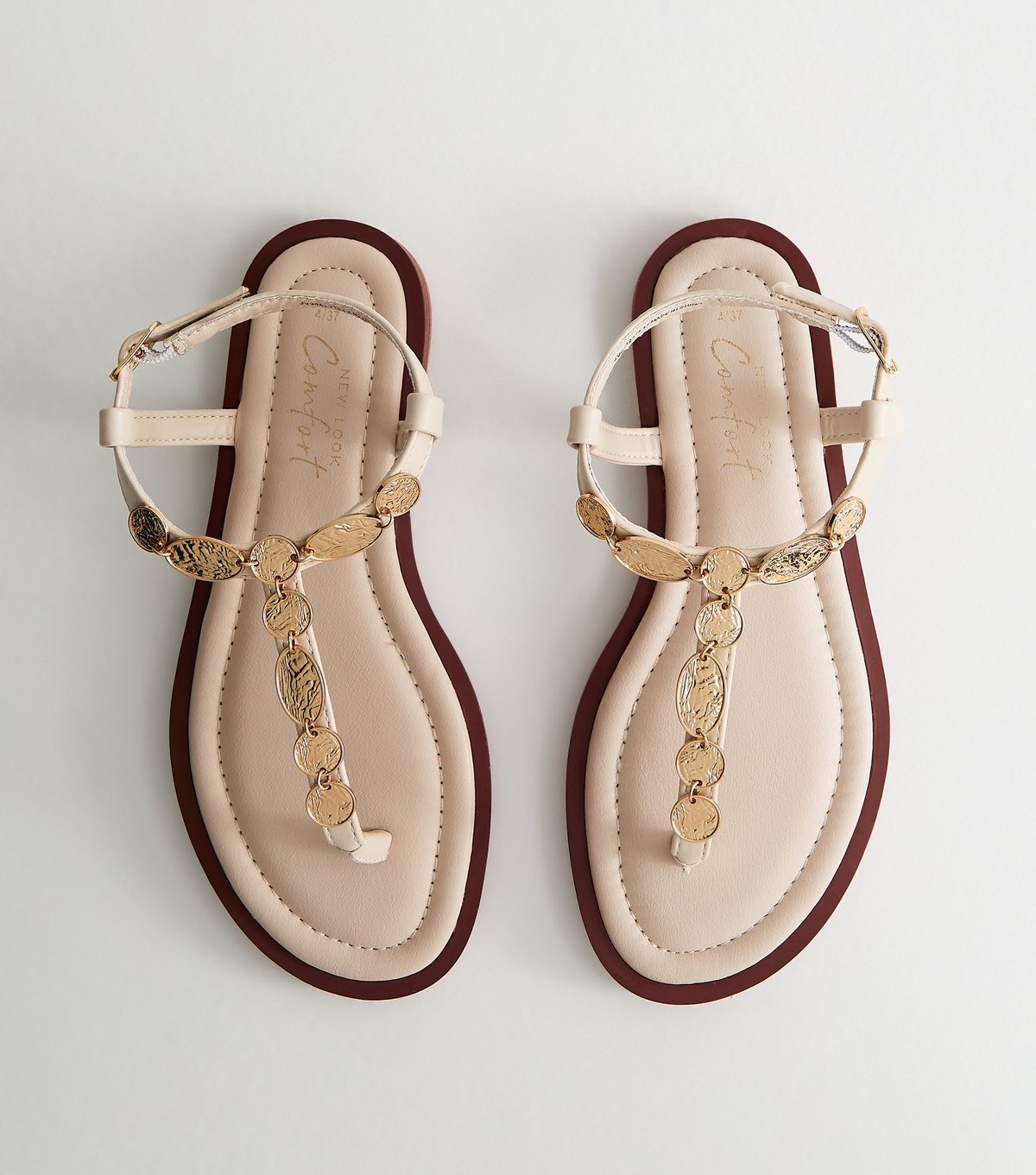The New Look Off White Gold Coin Trim Toe Post Sandals is made from faux leather.