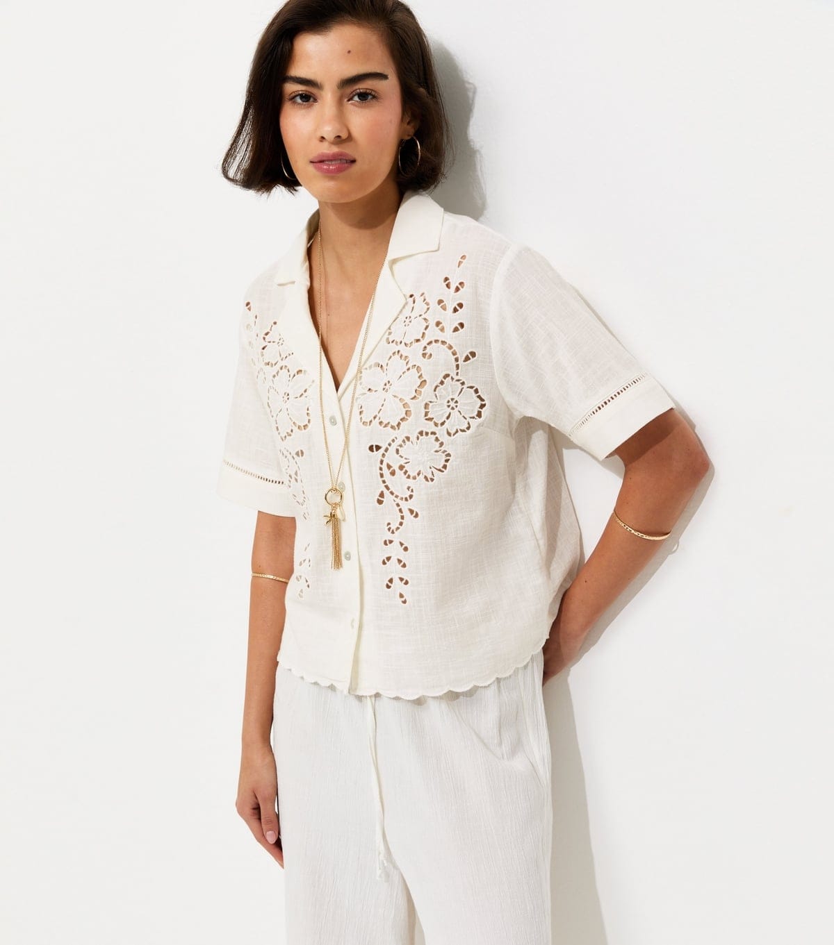 Stylish off white cotton crop shirt with a pretty cutwork design and scalloped hem. Perfect for casual and effortless style.