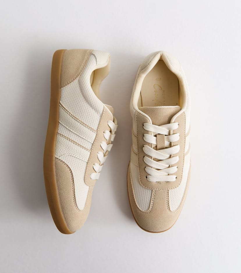 The New Look Off White Mesh and Faux Leather Trainers is available in sizes 3, 4, 5, 6, 7, 8, 9.