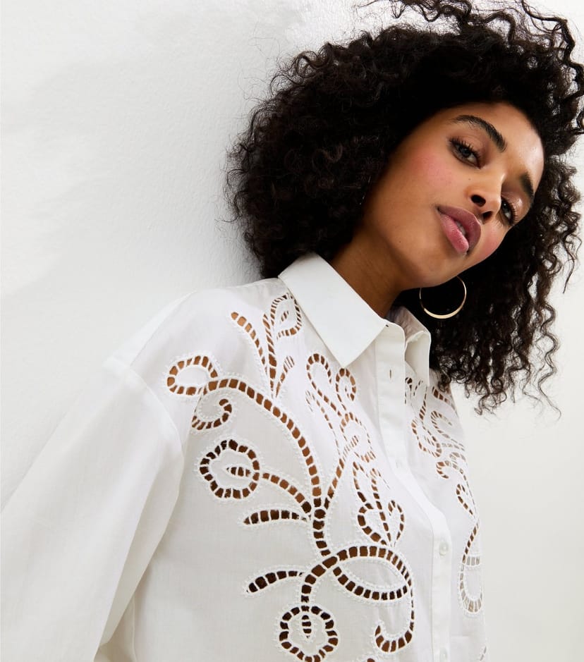 The New Look Off White Cotton Lace Embroidered Shirt is available in sizes 10, 12, 14, 16, 18, 20, 22, 6, 8.