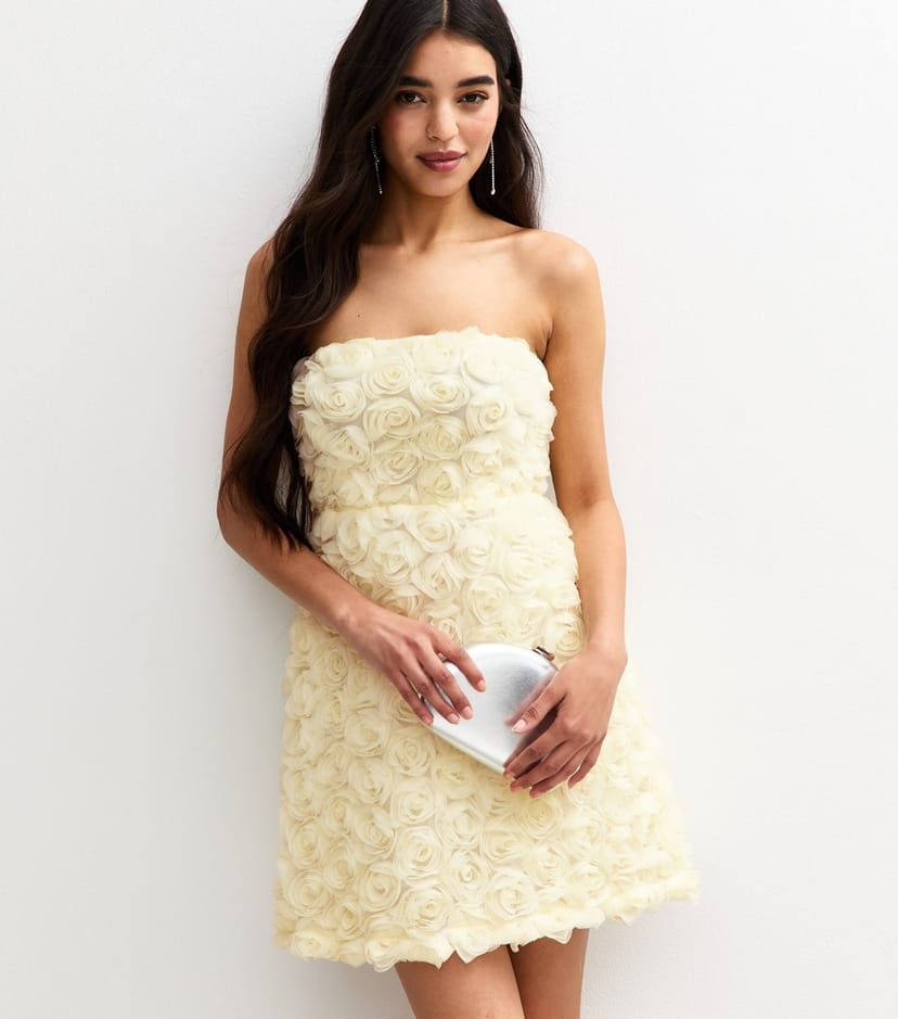 This off white bandeau mini dress by New Look is adorned with three-dimensional flowers. Its flared fit and A-line skirt create a flattering silhouette. Ideal for special occasions.