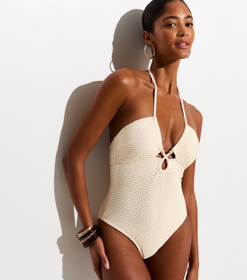 The New Look Off White Crochet Halter Neck Swimsuit is available in sizes 14, 6, 8.