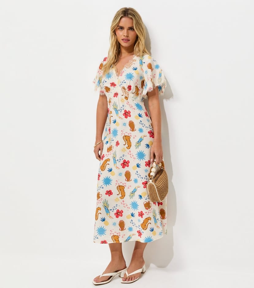 The New Look Off White Leopard Print Lace Trim Midi Tea Dress is ideal for casual, beach, daytime.
