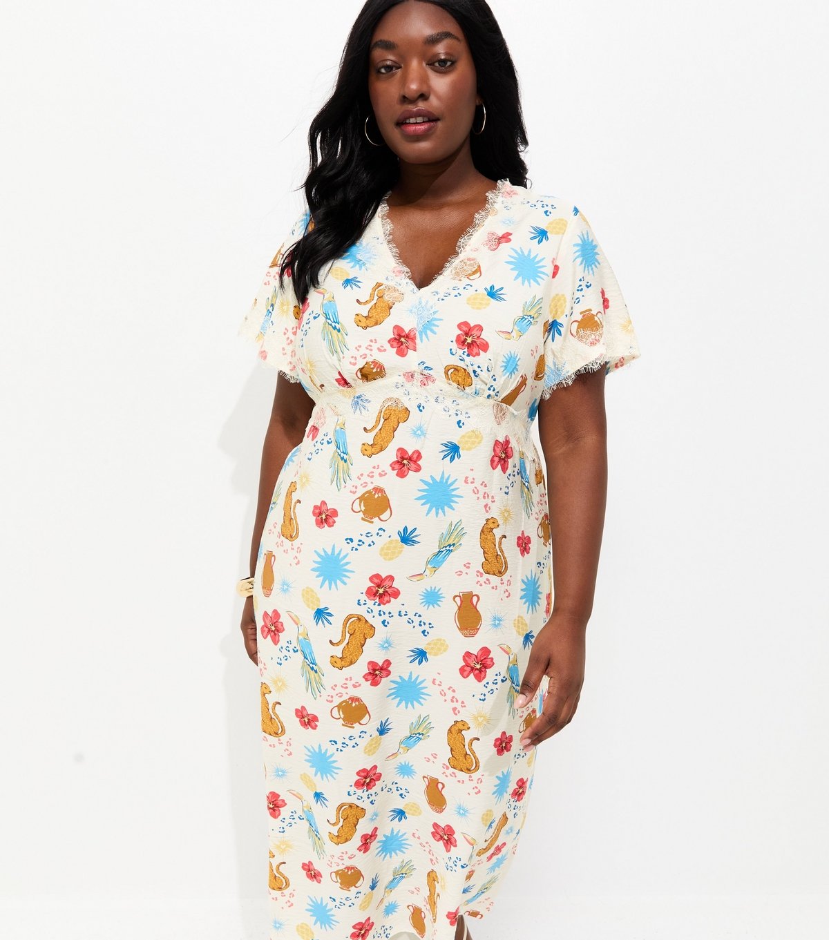 The New Look Cream Animal Print Midi Dress is available in sizes 18, 20, 22, 24, 26, 28, 30, 32.