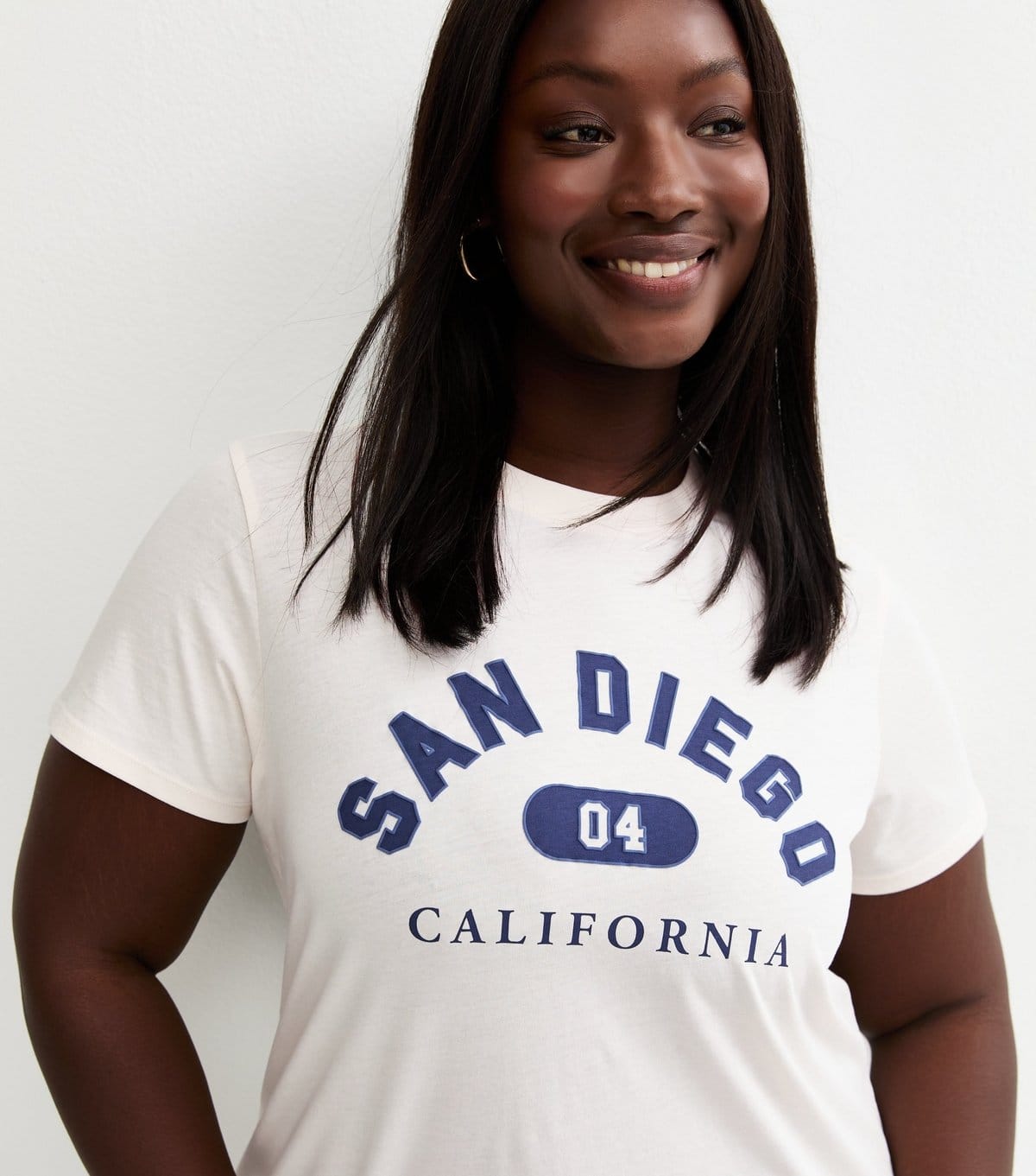 The New Look Off White San Diego Graphic T-Shirt Plus Size is available in sizes 18, 20, 22, 24, 26.