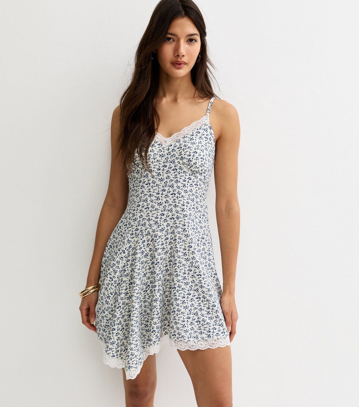 The New Look White and Blue Floral Lace Trim Mini Dress is available in sizes 10, 12, 14, 16, 18, 6, 8.
