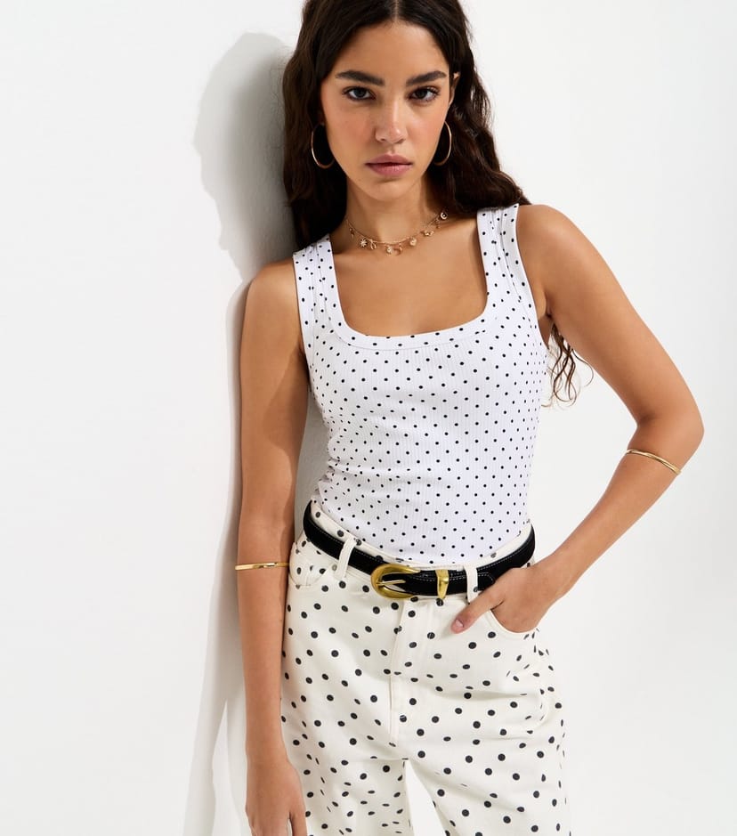 View New Look UK's returns policyPlayful and comfy, this white polka dot vest top by New Look features a square neckline and wide straps. Made from ribbed jersey, it's perfect for casual days.