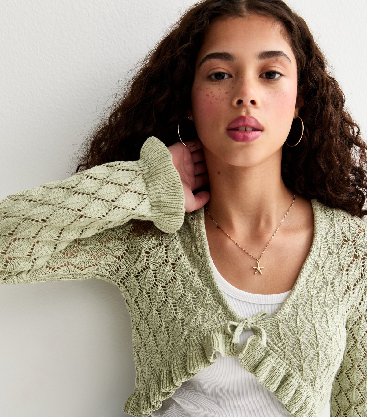 The New Look Light Khaki Crochet V-Neck Cardigan is available in sizes 10-11 YEARS, 12-13 YEARS, 14-15 YEARS, 9 YEARS.