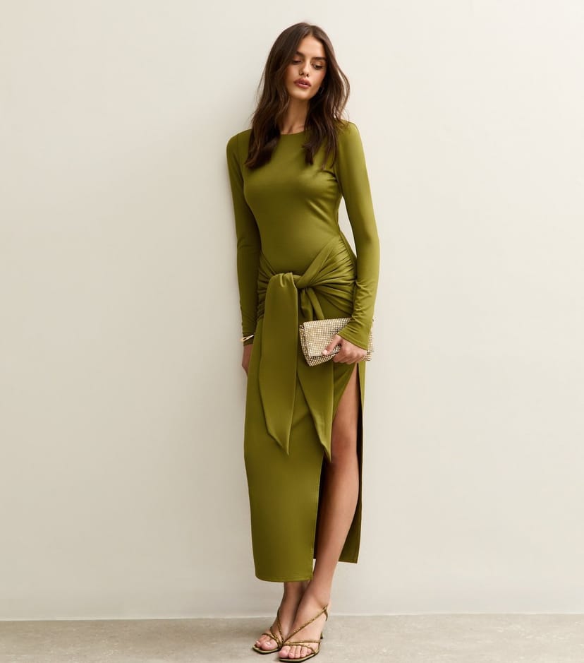 Turn heads with this olive jersey bodycon midi dress with added belted detail and a thigh high side split. The scooped low back and figure hugging fit add impact.